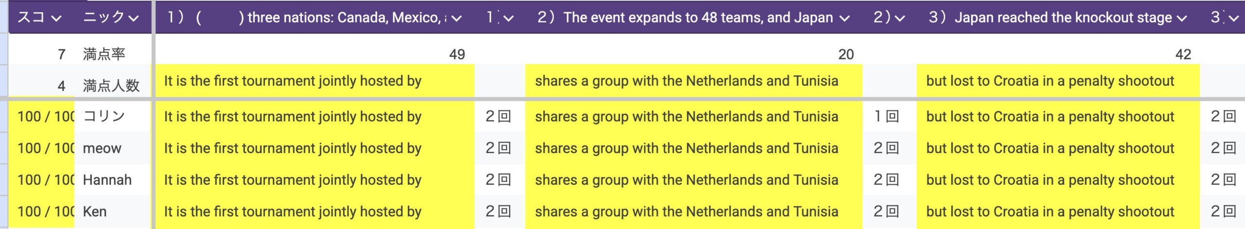 今回のディクテーションQuizの難易度は低めです。満点は4名、全問正解率は7%という成績でした。