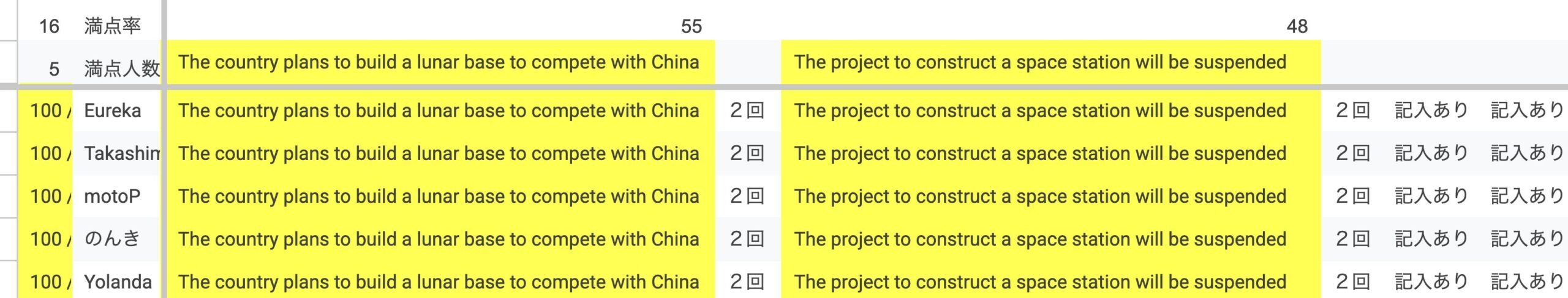 今回のディクテーションQuizの難易度は標準です。満点は5名、全問正解率が16%という結果でした。