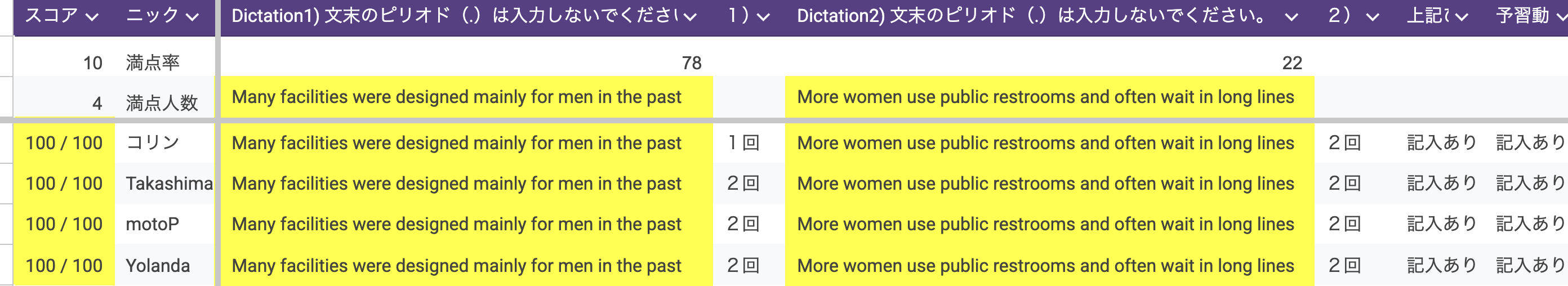 今回のディクテーションQuizの難易度はやや低めです。満点は4名、全問正解率が10%という結果でした。
