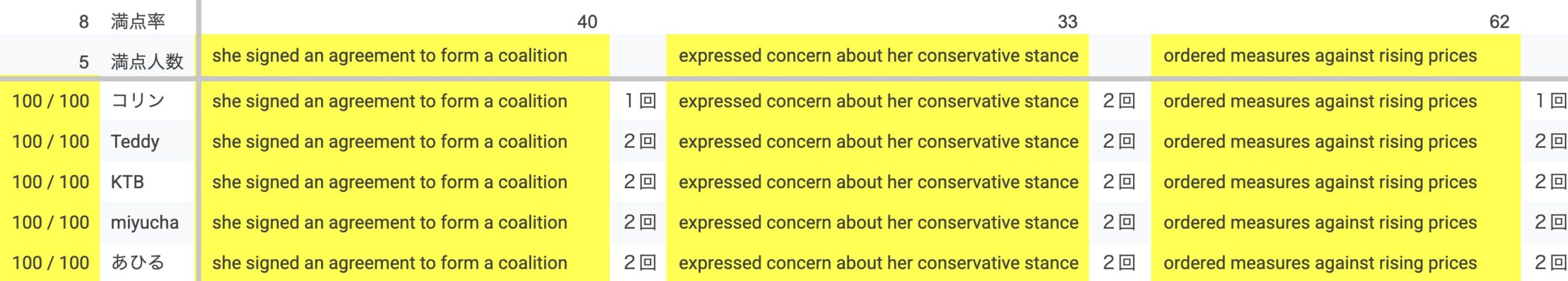 今週のディクテーションQuizの難易度はやや低めです。前回と同様、満点は5名、全問正解率は8%でした。